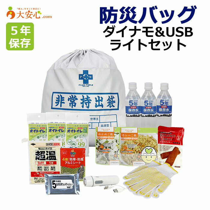 【防災バッグ ダイナモ&USB充電ライトセット】災害用備蓄バッグ LEDライト機能をはじめ、SOS点滅、スマホ・携帯充電が出来る頼もしいライト入!!