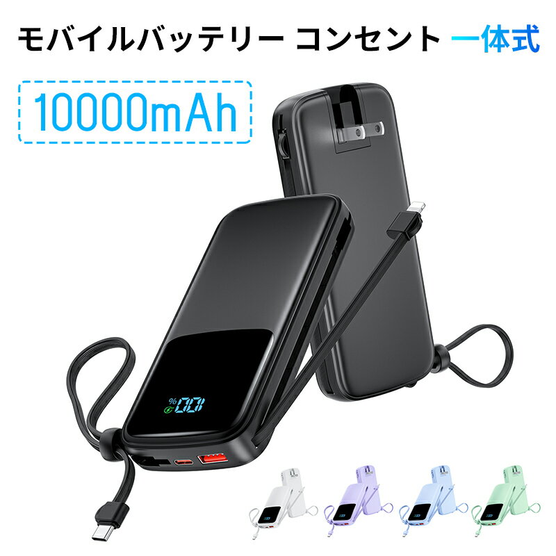 モバイルバッテリー コンセント 一体式 10000mAh 大容量 バッテリー モバイル【22.5W/PD20W急速充電・4台同時充電・パススルー・2本ケーブル搭載】Type-C PD3.0 携帯バッテリー スマホ充電器 小型 LCD残量表示 パワーバンク iPhone&iPad&Android その他など対応