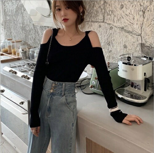 オフショルダー風 レディース トップス リブニット 長袖 シンプル 2色展開 フリーサイズ