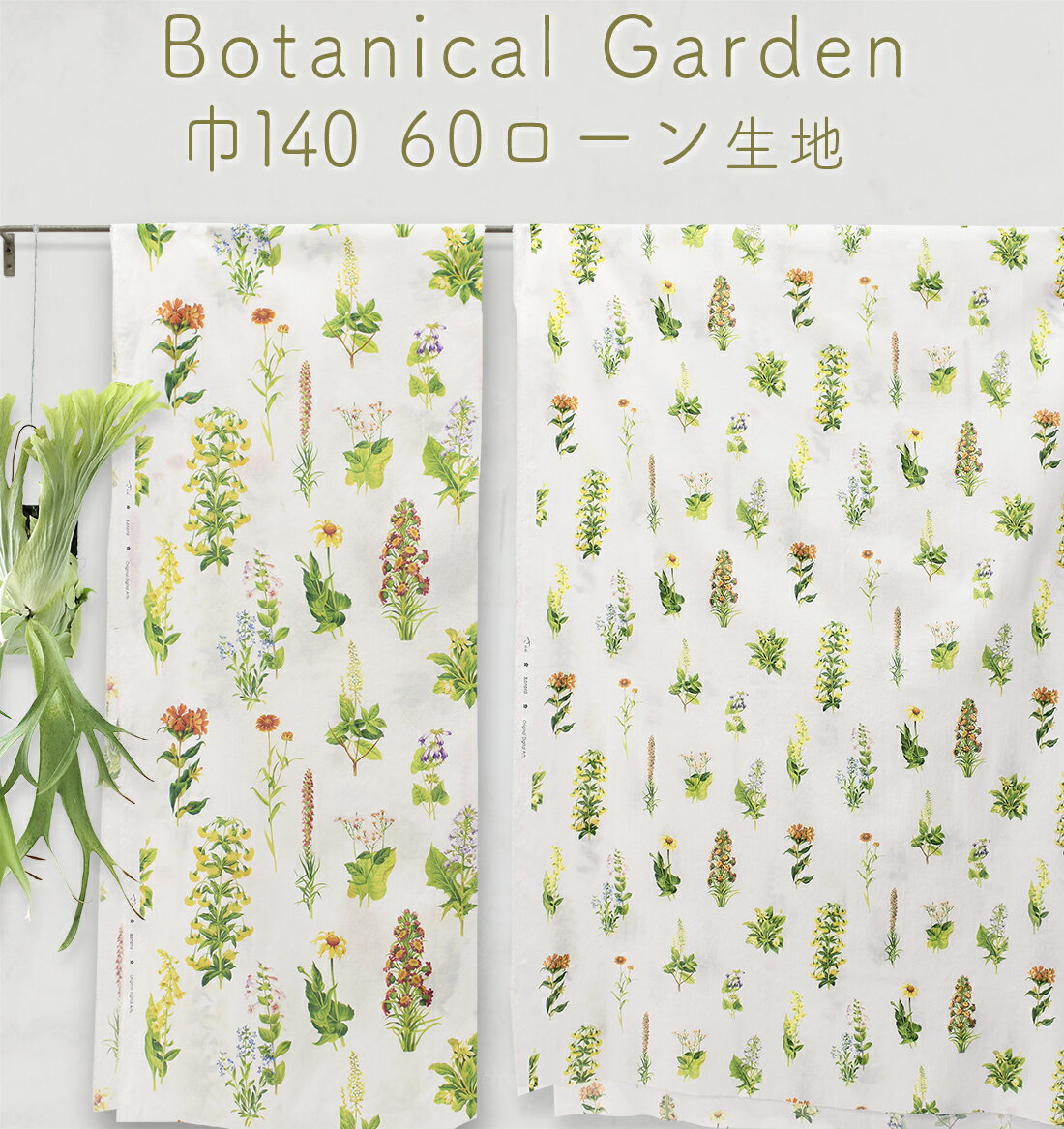 sararatextile Botanical Garden 60ローン 生地|広幅約140cm【2柄】10cm単位30cm以上からご注文下さい【ya_2】【2mまでネコポス可】リアルプリント|体操袋|型紙|ポーチ|小物|手芸|材料|キャンプ|植物|草木|鉢植|カーテン|癒し|ボタニカル|ガーデニング|スケア