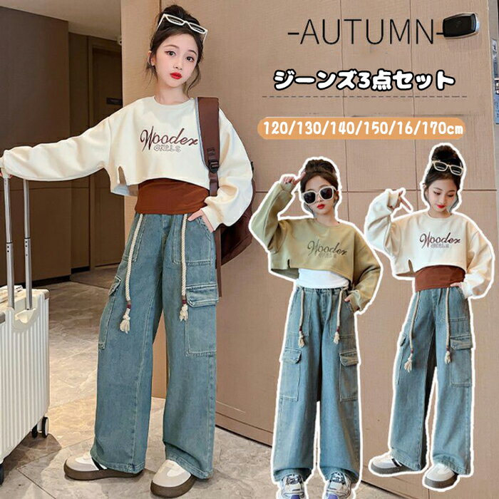 子供服 セットアップ 女の子 春秋 長袖 スウェット パーカー デニムパンツ ジーンズ 3点セット カジュアル 上下セット 普通着 ジャージ スポーツウェア パンツセット 学生 ジュニア服 体育祭 部屋着 普段着 通学着 小学生 中学生 おしゃれ 120/130/140/150/160/170cm