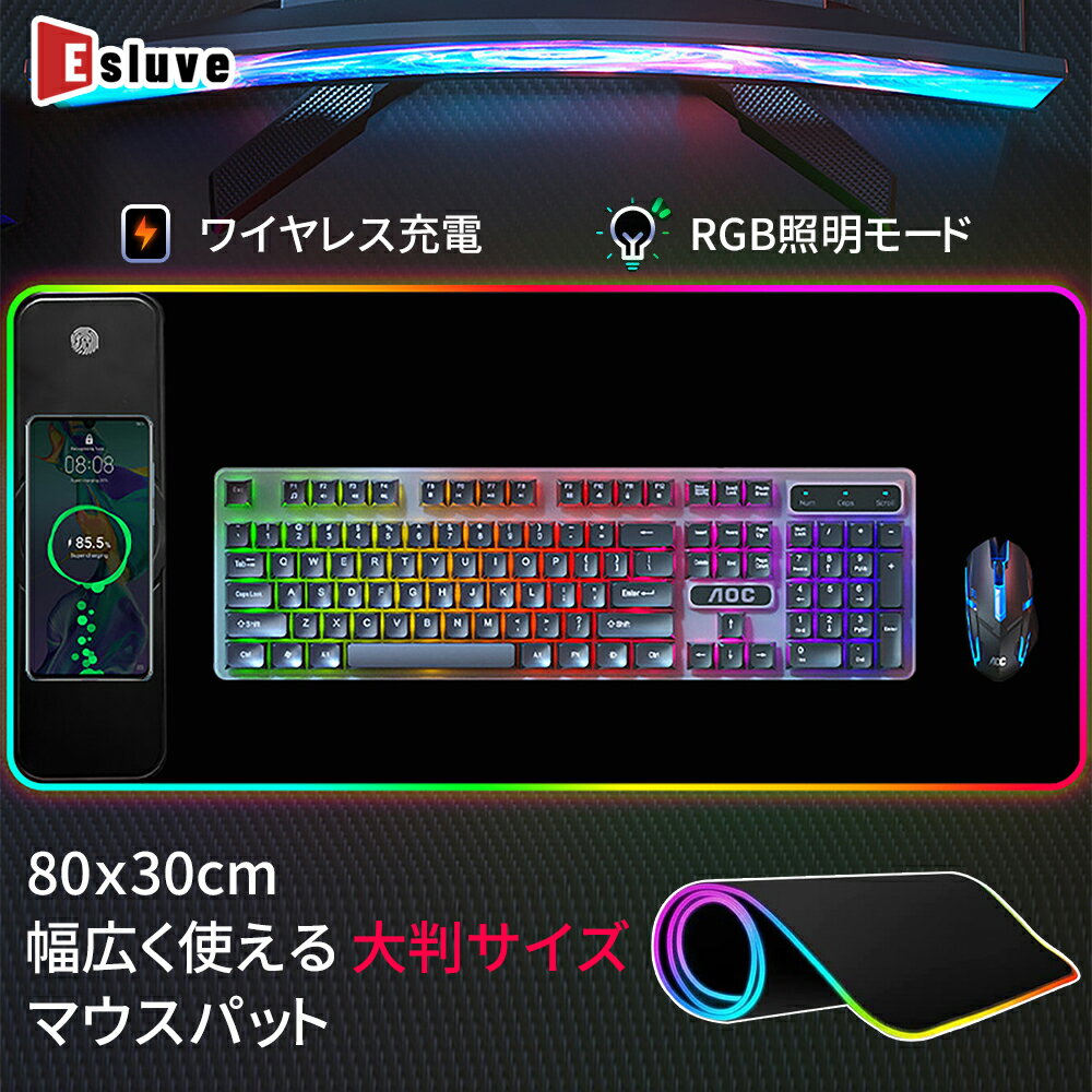 ESLUVE マウスパッド ゲーミング 大型 おしゃれ スマートフォン ワイヤレス充電 Qi充電 Qi充電器 LEDライト 多機能 一体型 置くだけ充電 デスクマット 防水 防塵 光るマウスパッド 無地 在宅ワーク PC パソコン 周辺機器 2年間保証