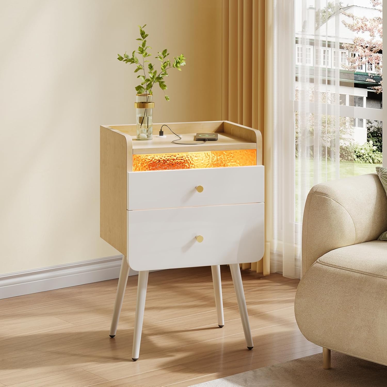 ベッドサイドテーブル 引き出し付き ナイトテーブル 幅40×奥行30×高さ64cm USB-A&USB-Cポート付き LEDライト付き おしゃれ サイドテーブル ベッド横 ソファ横 転倒防止 木製 ナチュラル