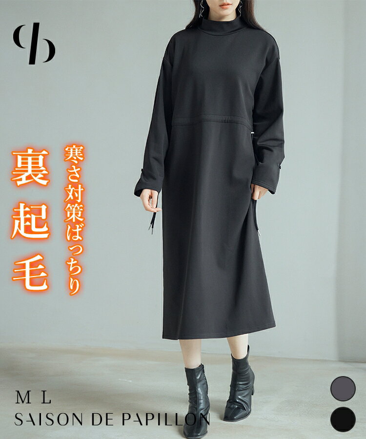 ワンピース レディース 裏起毛 ミモレ丈 プチハイネック スウェット 2way ウエストドローストリング ドロスト仕様 長袖 ウエストマーク 体型カバー 防寒 寒さ対策 厚手 暖かい カジュアル 楽ちん 女の子 秋 冬 SAISON DE PAPILLON sdp0244