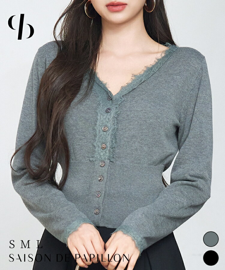 トップス レディース ニット ニットカーディガン ニットカーデ 長袖 Vネック ショート丈 ハイウエスト コットン100% 貝調ボタン 裾リブ編み レース付き 通勤 オフィス 秋 冬 女の子 きれいめ SAISON DE PAPILLON sdp8080