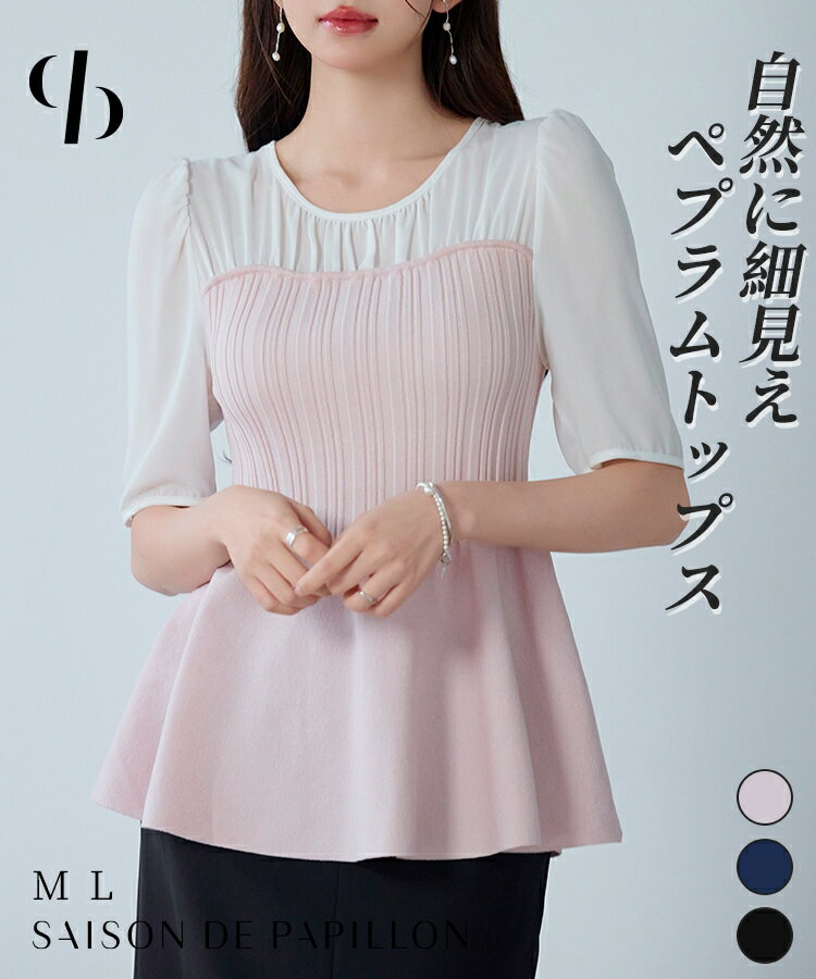 ブラウス レディース トップス プルオーバー 半袖 Tシャツ 異素材ドッキング ニット 布帛 ペプラムシルエット 体型カバー クルーネック 薄手ニット 普段使い 通勤 きれいめ フェミニン 女の子 SAISON DE PAPILLON sdp8127