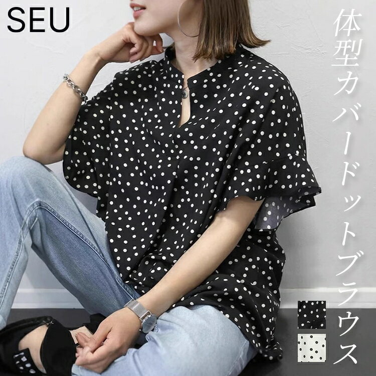 プリントデシンスキッパードット ブラウス ドット Vネック フリル 袖 ドレープ フェミニン 重ね着 大人 デシン ドルマンシャツ Vネックレディーストップス シンプル おしゃれ シャツ 通勤 SEU seu26nt1069