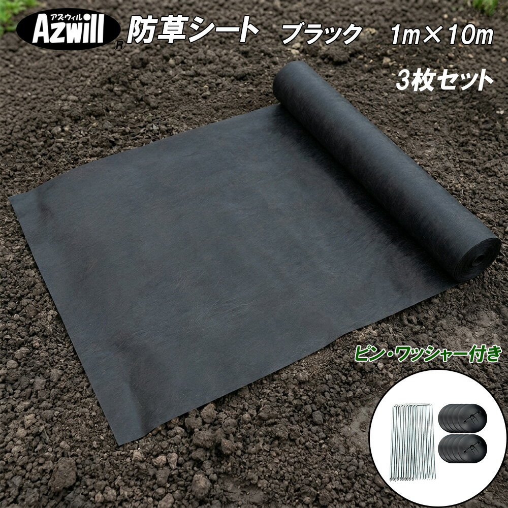 Azwill(アズウィル)防草シート 1×10m 3枚セット 高品質 高耐候 高耐久 高透水 簡単施工 極太繊維 透水性 耐候性 雑草抑制 ポリプロピレン ピン・ワッシャー付 緑色 黒色 除草 雑草 手間いらず 敷くだけ 労力軽減 人工芝 軽量 簡単 ペット 安心 安全 UV加工 砂利下