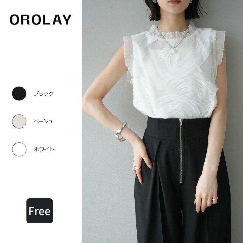 Orolay レディース ブラウス ノースリーブ レース付き スタンドカラー 後ろボタン 通勤 上品 軽奢華 刺繍&立体花 無地 プリーツ スリム ポリエステル 大人可愛い