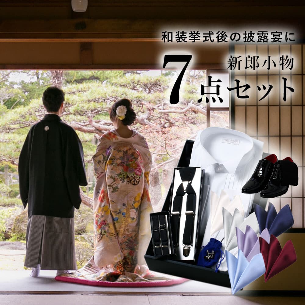 【神前式後披露宴 7点セット】 新郎 小物 セット ウィングカラーシャツ 結婚式 挙式 披露宴 お色直し 二次会 ブライダル 衣装 タキシード フォーマル ウィングカラーシャツ アームバンド サスペンダー チーフ エナメルシューズ 黒靴下 神前式 神社 和装挙式