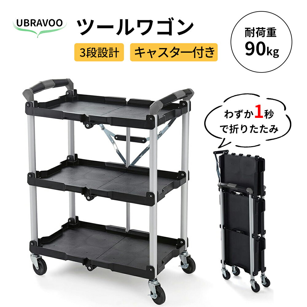 \0の日限定 ポイント5倍/ UBRAVOO ツールワゴン 折りたたみ 3段 キャスター付き ワゴン キッチンワゴン キャリーワゴン 収納 カート 折り畳み ツールボックス デスクワゴン 工具 棚 黒 配膳 作業台 撮影機材 台車 ラック 掃除用 2年間保証