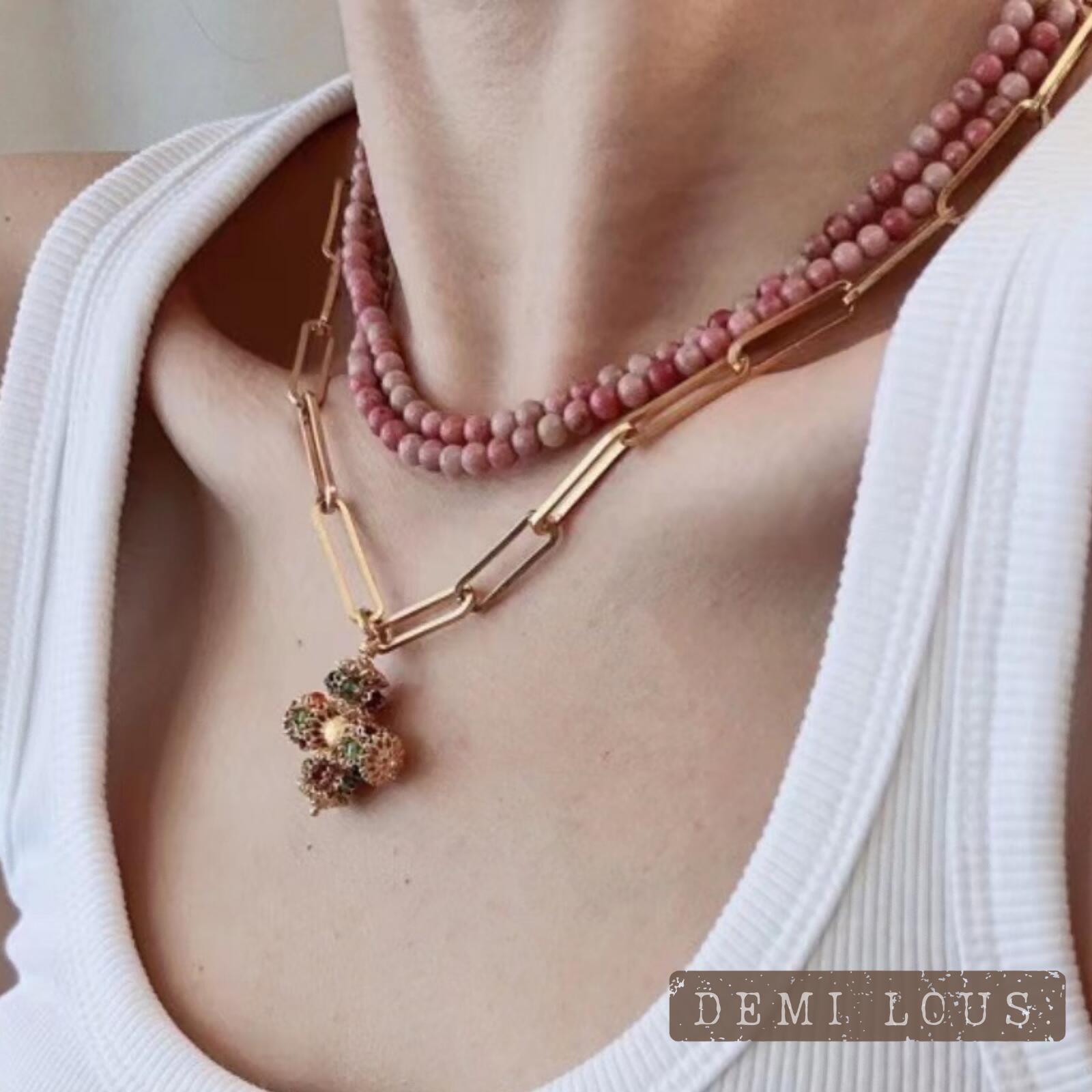 天然石ピンクビーズ 2連チョーカー風ネックレス 個性デザイン 大人可愛い 華奢レイヤード風 コーデの差し色に 斜め掛けOK 小顔見せにも