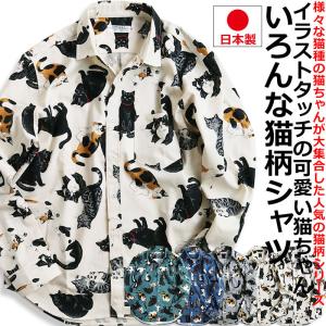 長袖シャツ メンズ 猫柄 シャツ 柄シャツ ねこ ネコ アニマル 動物柄 日本製 にゃんこ 爆買