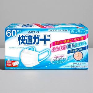 白元アース 快適ガード マスク ふつうサイズ 60枚入 個別包装 つるさら素材 幅広耳ひも PM2.5対策