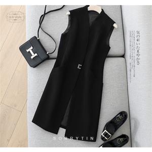 テーラード レディース ジレベスト 着痩せ チュニック シンプル Vネック ロングベスト 無地 ポケット付き ノースリーブ 前開きベスト