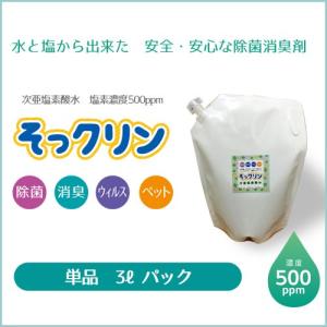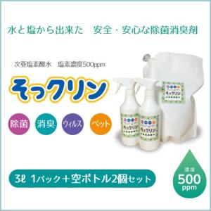 水と塩から出来た 次亜塩素酸水3L 濃度500ppm そっクリン 3Lパック 安全、安心な除菌、消臭剤 ノロ、インフルエンザ