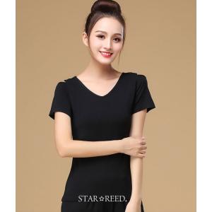 レディース ダンス用シャツ トップス 半袖Vネック 黒 デコルテ 鎖骨 着心地 レッスン着 フラメンコ 社交ダンス ラテンダンス 練習着 ブラウス