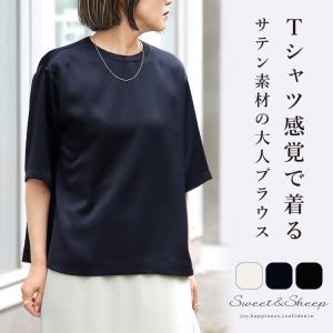 ブラウス トップス レディース Tブラウス Tブラ サテン プルオーバー 半袖 5分袖 tブラウス 大人 きれいめ カジュアル Tシャツ 仕事 通勤 春 夏 インナー