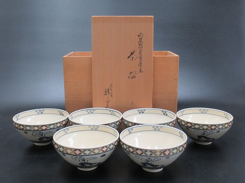Product name: D3255 杉田祥平 清閑寺窯 天目色絵七宝安南唐子画 茶碗 6客 数茶碗 抹茶碗 茶器 茶道具 共箱