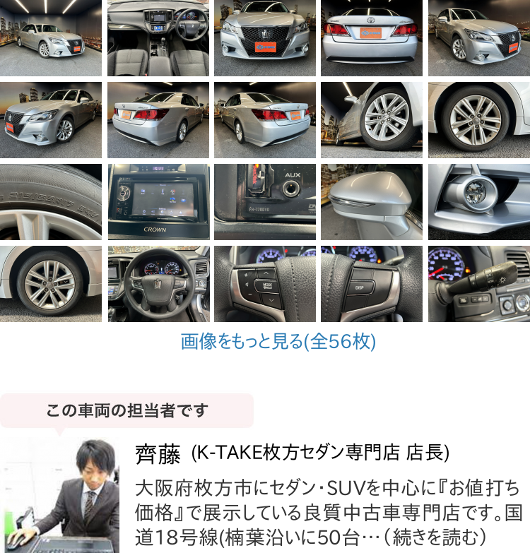 K-TAKE枚方店は国産セダン・SUV・ステーションワゴンを中心に取り扱いしております。趣向性の高い車種になりますので、専門知識を持ったスタッフにてご案内させて頂きます。コーティングやカスタム等はもちろん、任意保険、オートローンまで安心のカーライフをお約束致します。整備、保証などのアフターサービスも当店ですべて行えますのでご安心ください。当社は全国のオークション会場、約160カ所と業務提携を結んでおります。全国60000台以上の中古車を当店でご商談、ご契約、ご納車可能です!