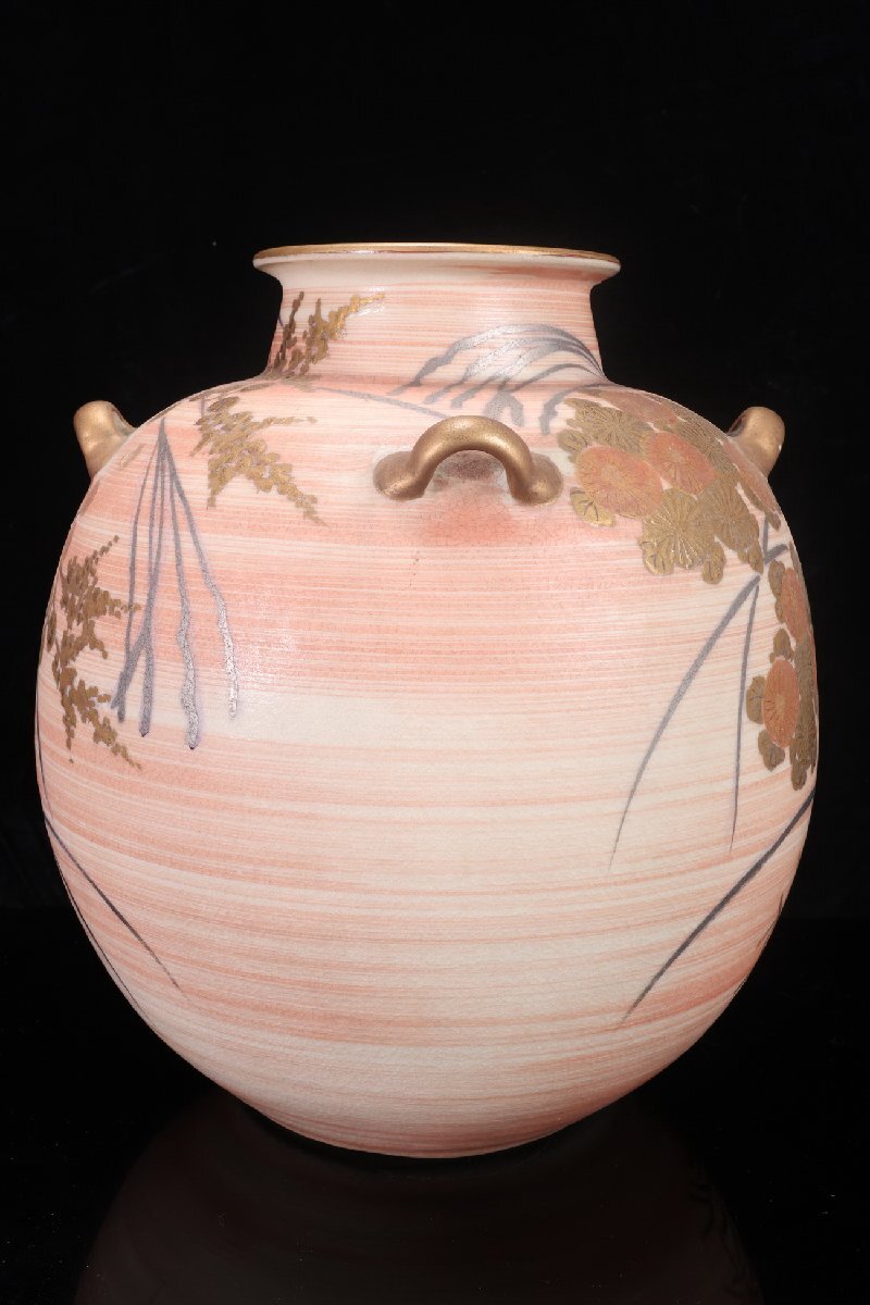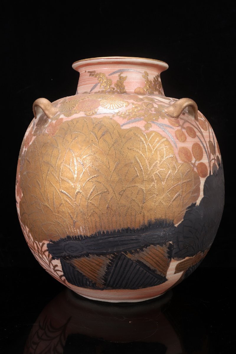 Product name: 【珍品堂】1円から P87-V01 京焼 清水焼 藤平正文 作 在銘 金彩 染錦 高31cm 四耳 花瓶 飾壺 花器 花生 花入 置物 骨董品 古美術 時代