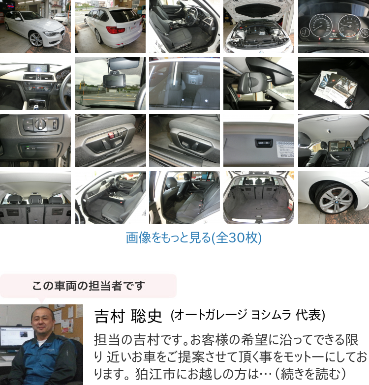 車両状態コメントご覧頂きありがとうございます!BMW320ツーリングになります。車検R9年8月11日!!人気のホワイト!もちろんスマートキー!ナビ!ETC!パワーゲート付きです!スペアキーレスも付いてます^^是非この機会に長く乗れるツーリングワゴンは如何でしょうか^^試乗大歓迎!!気に入れば乗って帰れます(条件あり)先ずはお問い合わせください。