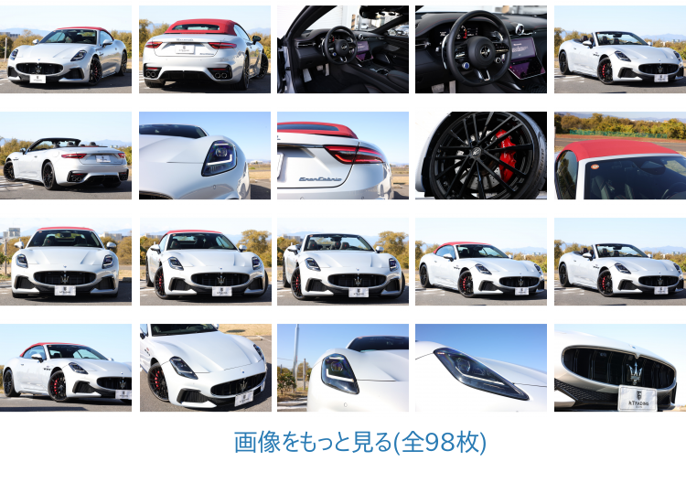 <フル装備><パワーソフトトップ/グラナータ><テックアシスタンスPKG><スポーツデザインPKG><8AT><パドルシフト><スマートキー><アダプティブLEDヘッド><ネロ/ロッソフルレザーインテリア><ヘッドレストトライデントステッチ入り><シートヒーター><ベンチレーター><エアスカーフ><グロッシーブラック仕上げ「ペガソ」鍛造AW フロント20リア21インチ><レッドペイントブレーキキャリパー><純正ナビ><12.3inchアッパータッチパネルディスプレイ><8.8inchロアータッチパネルディスプレイ><フルセグ><純正OP Sonus faber High-Premium Audio><アラウンドビューカメラ><12.2inch液晶メーターパネル(4パターン表示)><フレームレスデジタルルームミラー><アルカンターラルーフ><アダプティブクルーズコントロール><ヘッドアップディスプレイ><マットカーボンツイルインテリアパネル><マセラティロゴ入りイルミネーテッドドアシル>