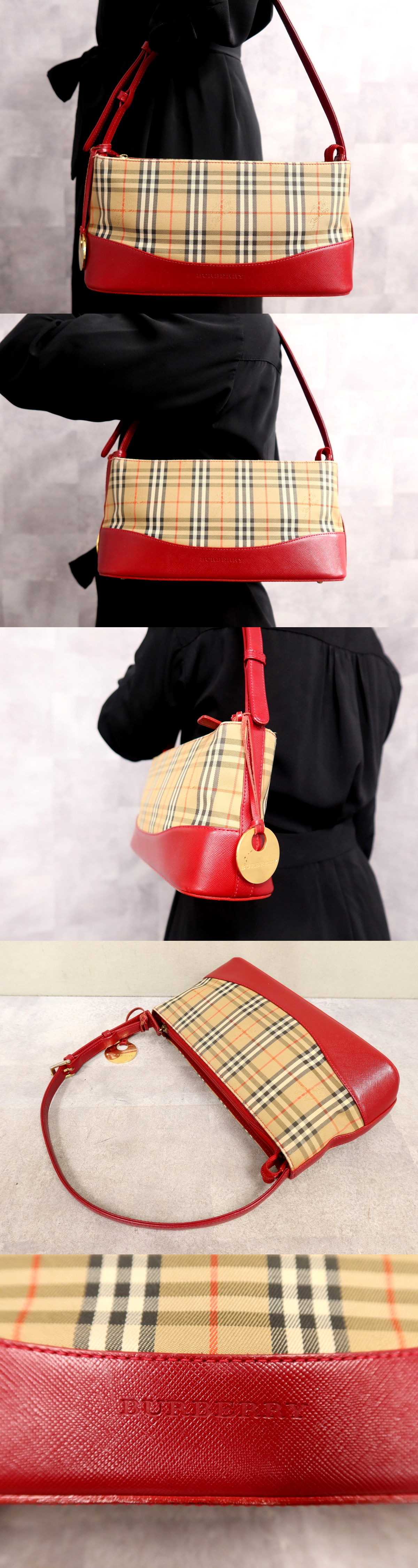 Store 超美品●バーバリー●ノバチェック●ロゴ型押し●キャンバス サフィアーノ レザー 本革●ショルダー バッグ●赤 ベージュ●G金具●Js66556