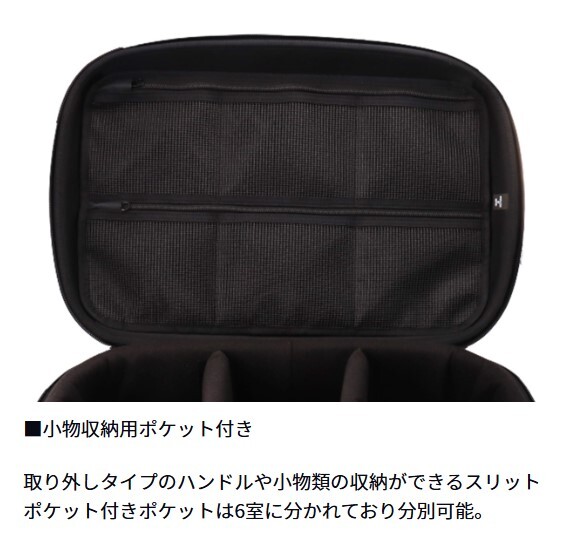 リールハンドルや小物の収納が可能なポケット付き(6室)