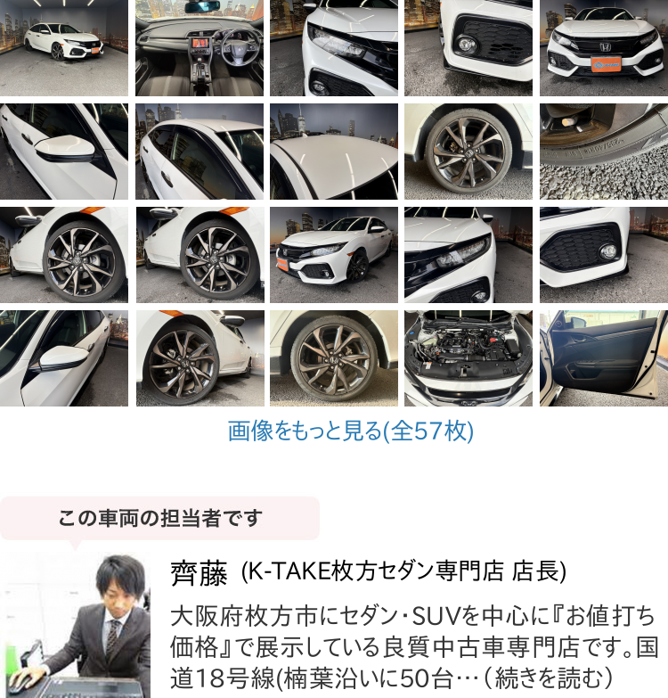 K-TAKE枚方店は国産セダン・SUV・ステーションワゴンを中心に取り扱いしております。趣向性の高い車種になりますので、専門知識を持ったスタッフにてご案内させて頂きます。コーティングやカスタム等はもちろん、任意保険、オートローンまで安心のカーライフをお約束致します。整備、保証などのアフターサービスも当店ですべて行えますのでご安心ください。当社は全国のオークション会場、約160カ所と業務提携を結んでおります。全国60000台以上の中古車を当店でご商談、ご契約、ご納車可能です!