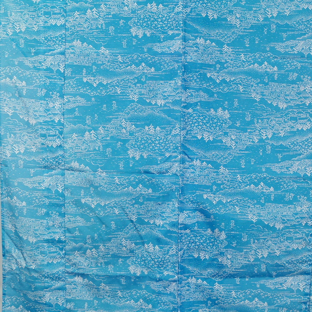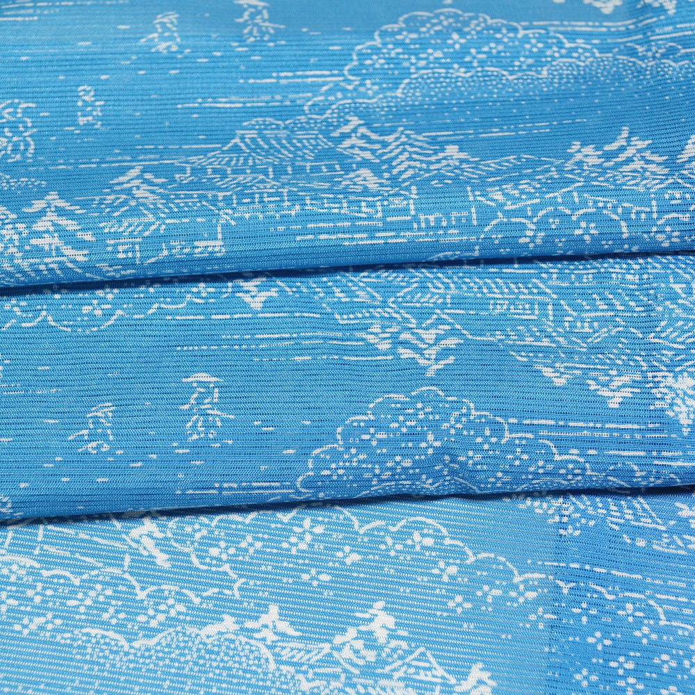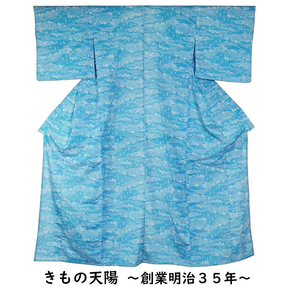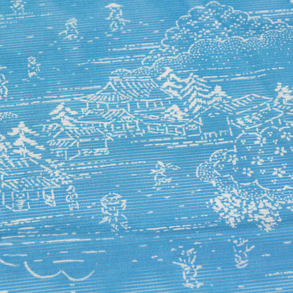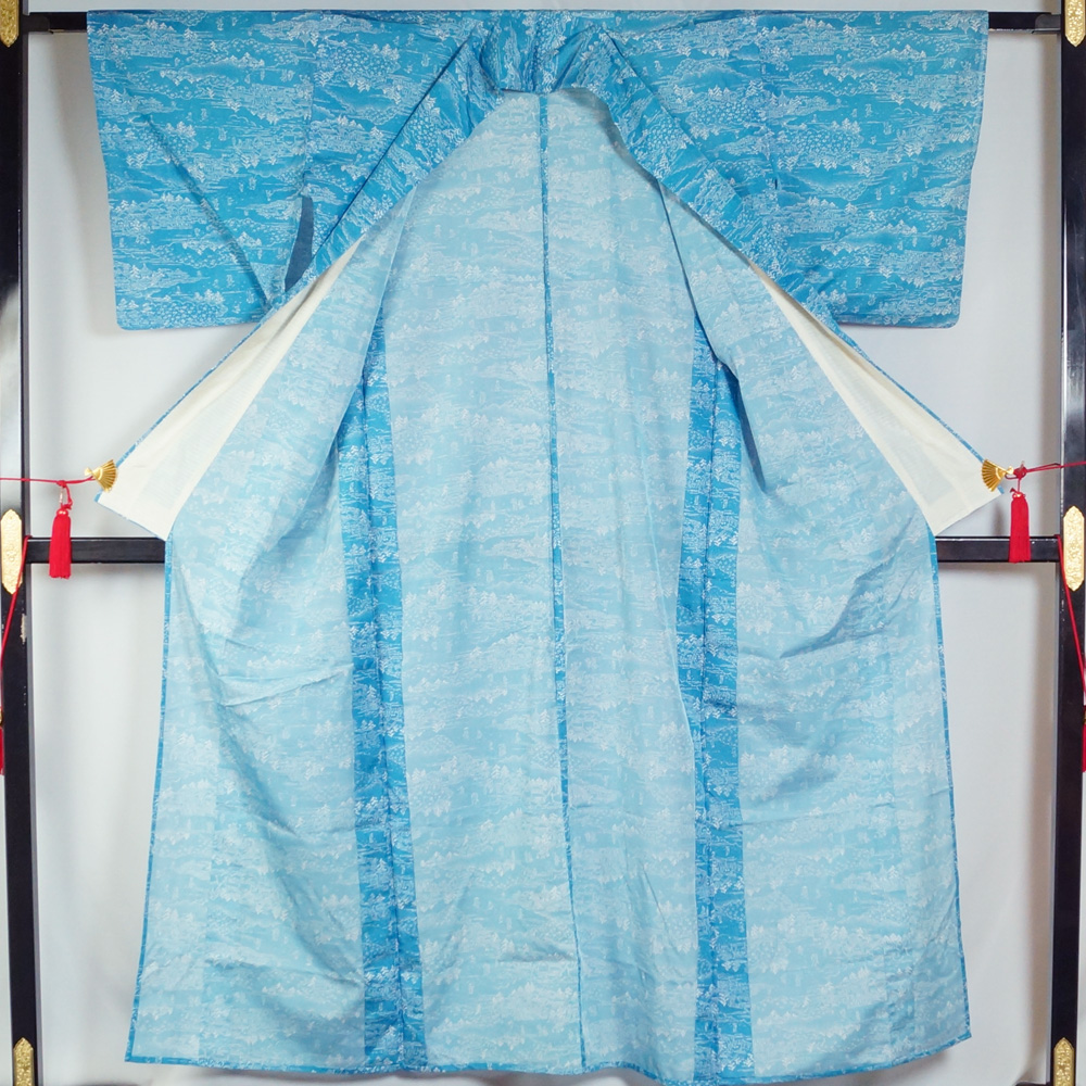 薄めのシアン色系の化繊絽地に江戸風景模様が染められた夏の小紋です。