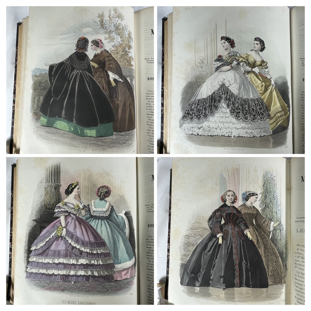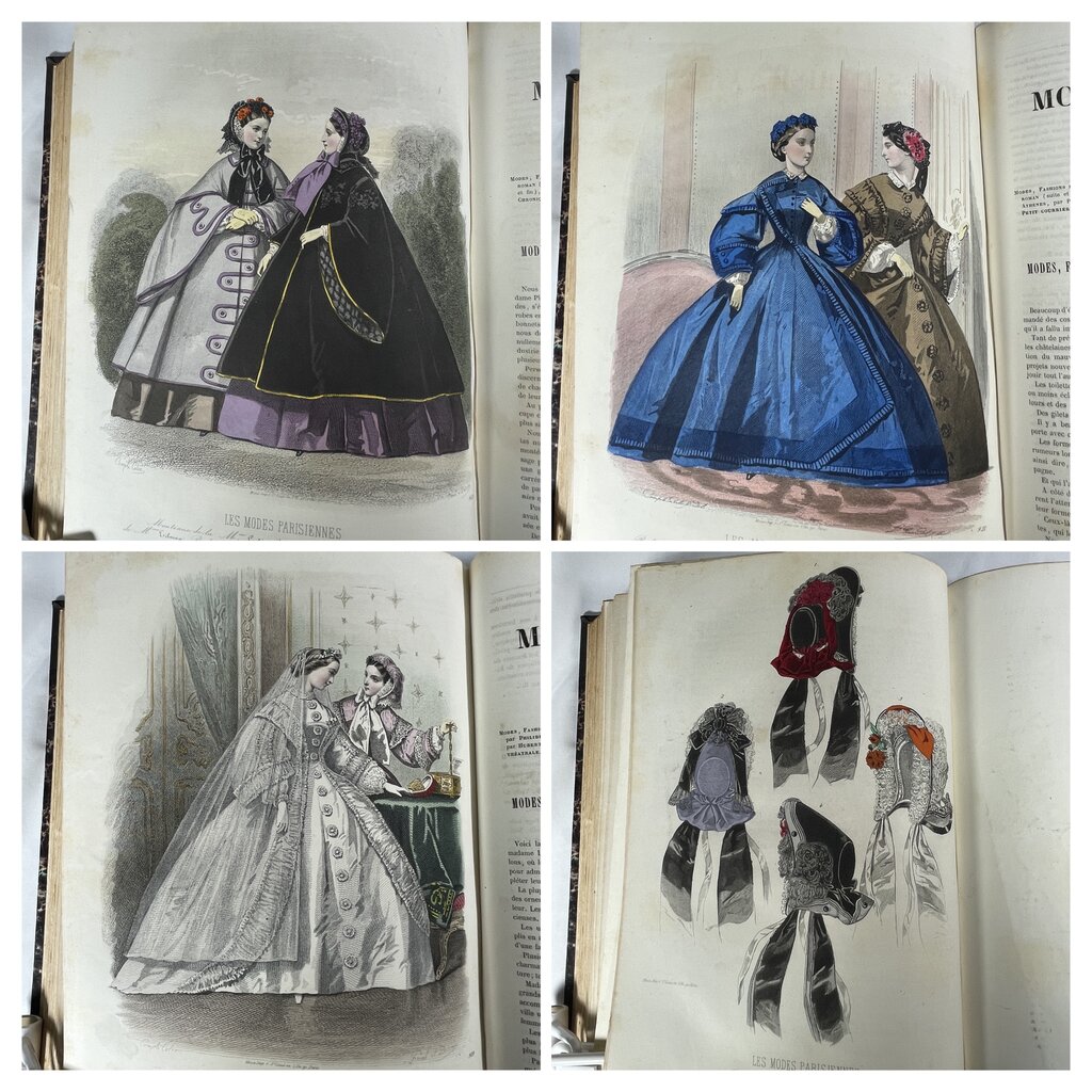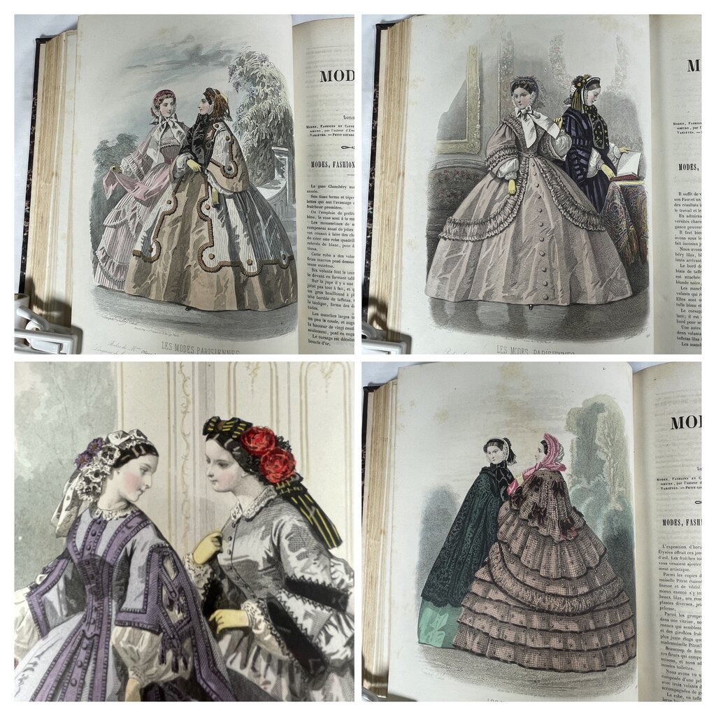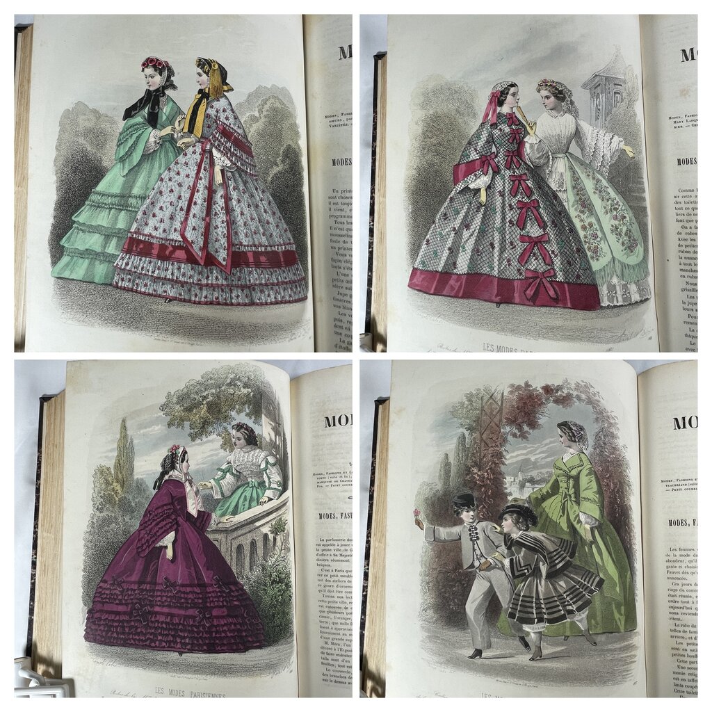 稀少1860年 レ・モード・パリジェンヌ Les Modes Parisiennes 手彩色カラーファッションプレート56点 豪華半革装 19世紀フランス モード誌