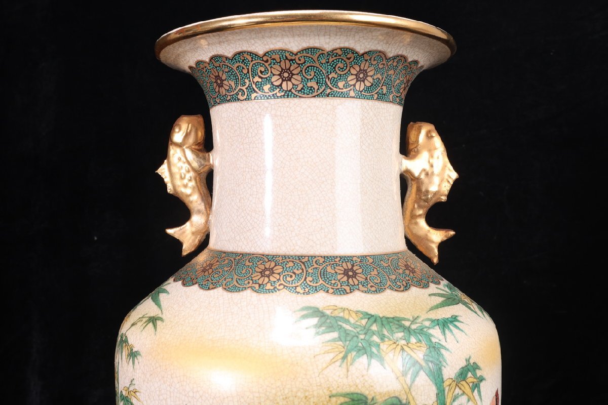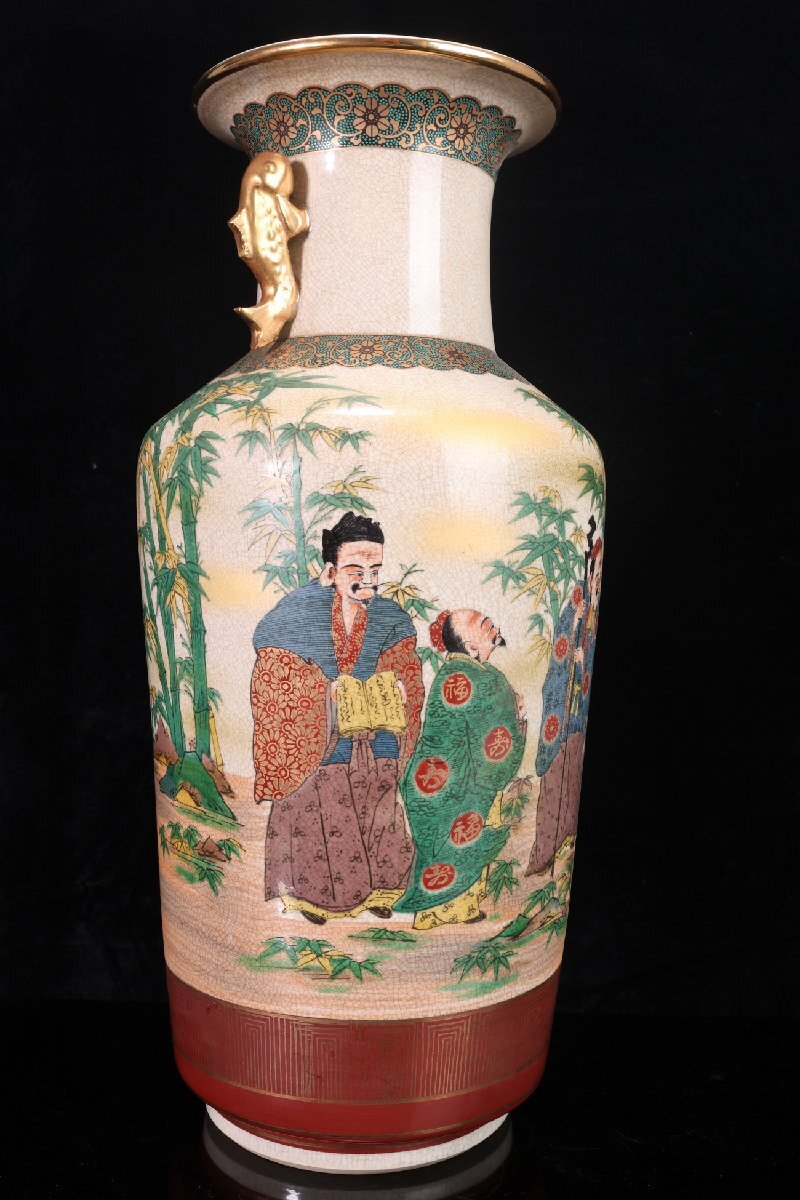 Product name: 【珍品堂】1円から V02-V03 薩摩焼 金彩 色絵 人物像 花草紋 鯉耳付 双耳付 花瓶 高47cm 大花瓶 飾壺 壺 花入 陶器 伝統工芸 骨董品 古美術