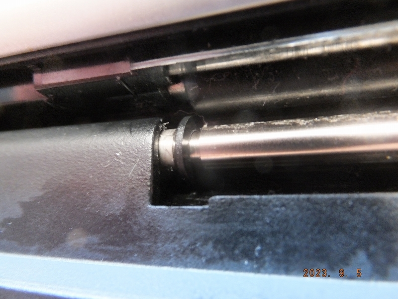 写真6枚目のようにスポンジが付いていた溝にラジオペンチで開いた部分を心棒に押し込むとローラーのずれを防止できます。