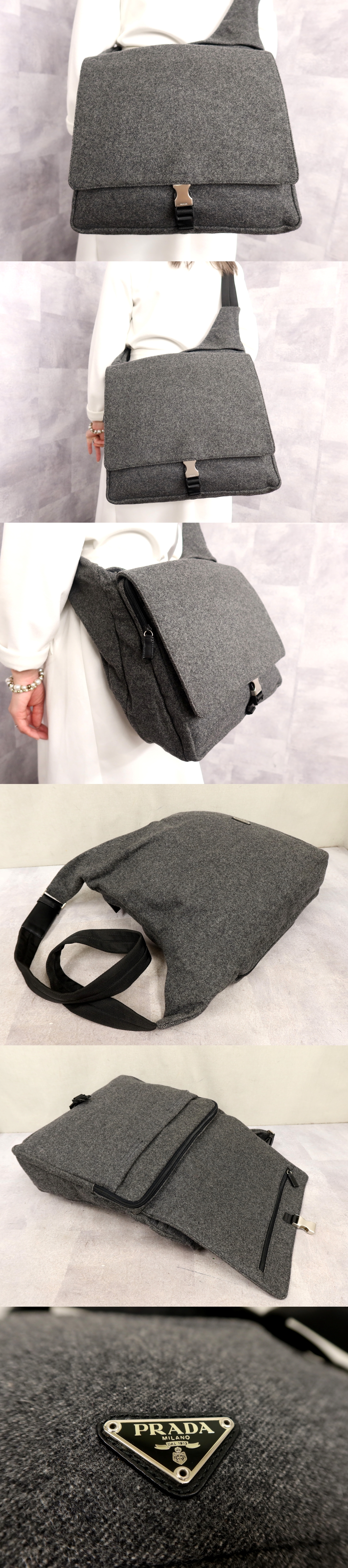 Product name: ●超美品●PRADA プラダ●メンズ●三角ロゴプレート●ウール カーフ レザー 本革●ショルダー バッグ●グレー 黒●SV金具●B5●Js64381