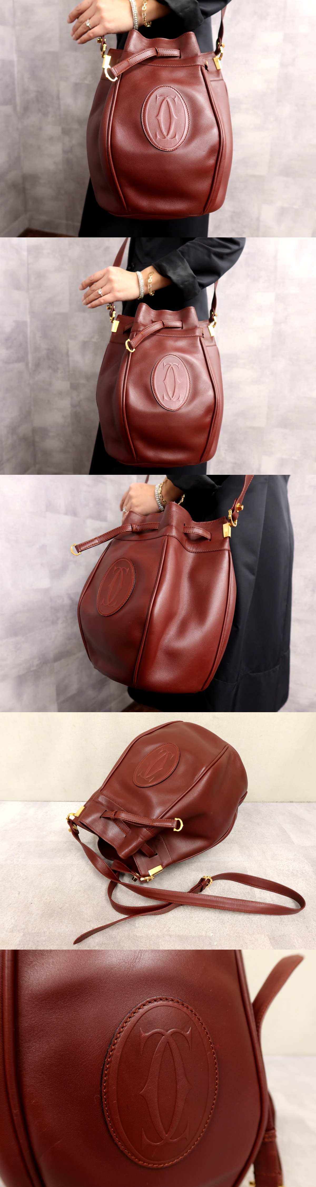 Store ●超美品●Cartier カルティエ●マスト●カーフ レザー 本革●巾着 ショルダー バッグ●ボルドー●ゴールド金具●肩掛け●かばん●Js64347
