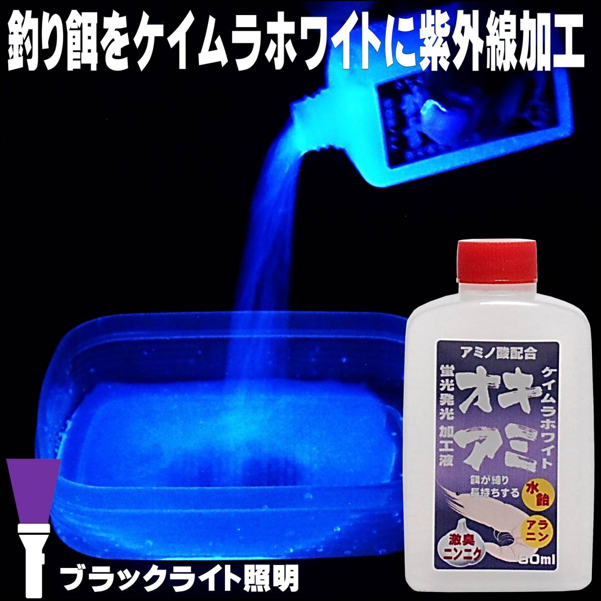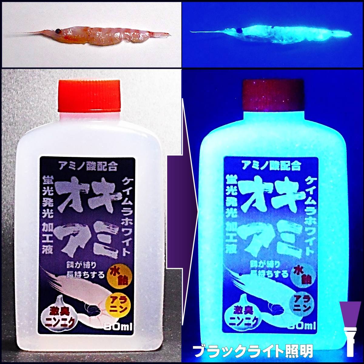 アミノ酸アラニン・激臭にんにく・甘味水飴・餌締め塩配合 紫外線加工液 紫外線蛍光発光 ケイムラホワイト(クリア)80ml オキアミ。